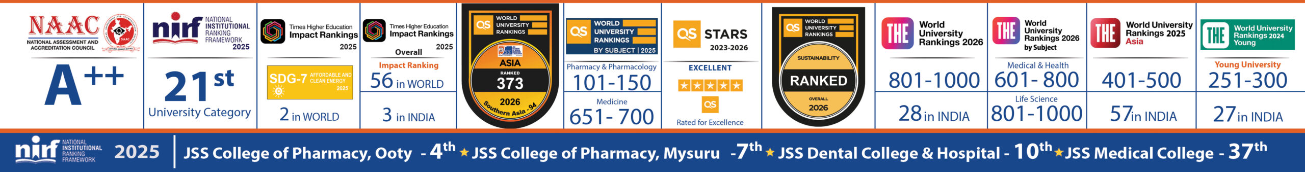 JSS Academy of Higher Education & Research is a Deemed to be University located in Mysuru, Karnataka. It was established in 2008 under Section 3 of the UGC Act 1956 and is part of JSS Mahavidyapeetha, which runs a variety of educational institutions. This deemed-to-be university is recognized by Ministry of Education and accredited by NAAC with A++ Grade (3.61 CGPA). JSS AHER has been graded as Category -I Deemed-to-be University by UGC. The Deemed to be University has made great progress in grooming graduates, postgraduates, and Ph.D. researchers by providing effective value-based education across our institutions by focusing on overall development of an individual through state-of-art facilities to make the learner a useful citizen to the society.